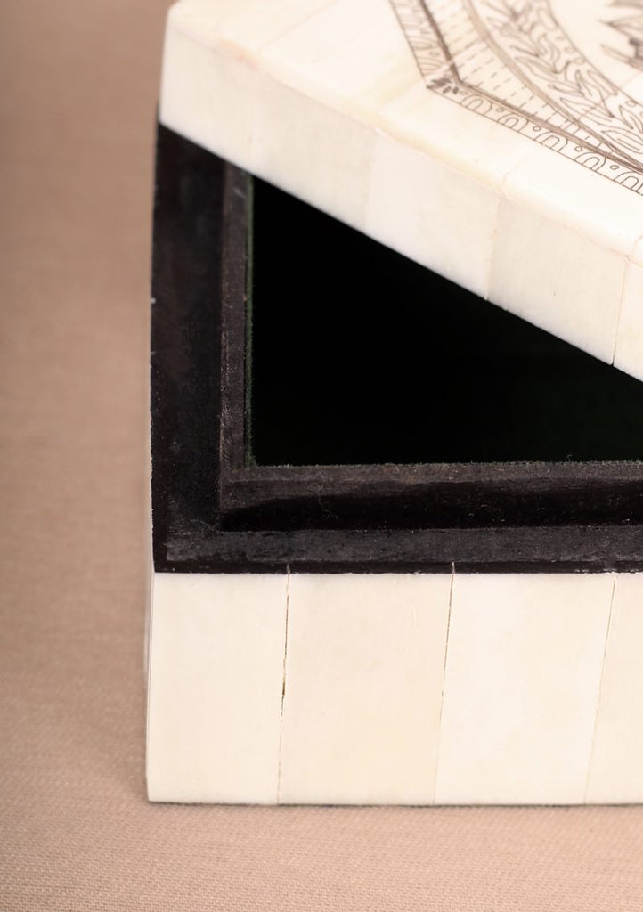 Cajita de hueso, pintada a mano. Un objeto súper versátil porque combina en cualquier espacio. Se puede ver divino en el librero o en una mesa de centro. Pintado artesanalmente con mucho detalle. Un regalo también para hombre; increíble, original y atemporal.