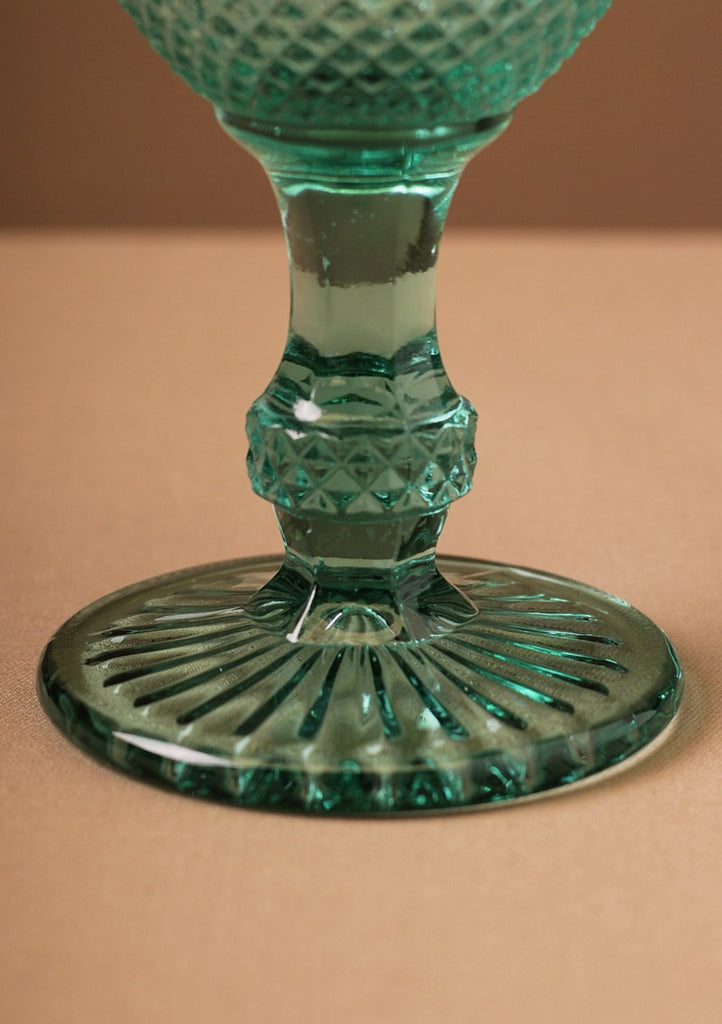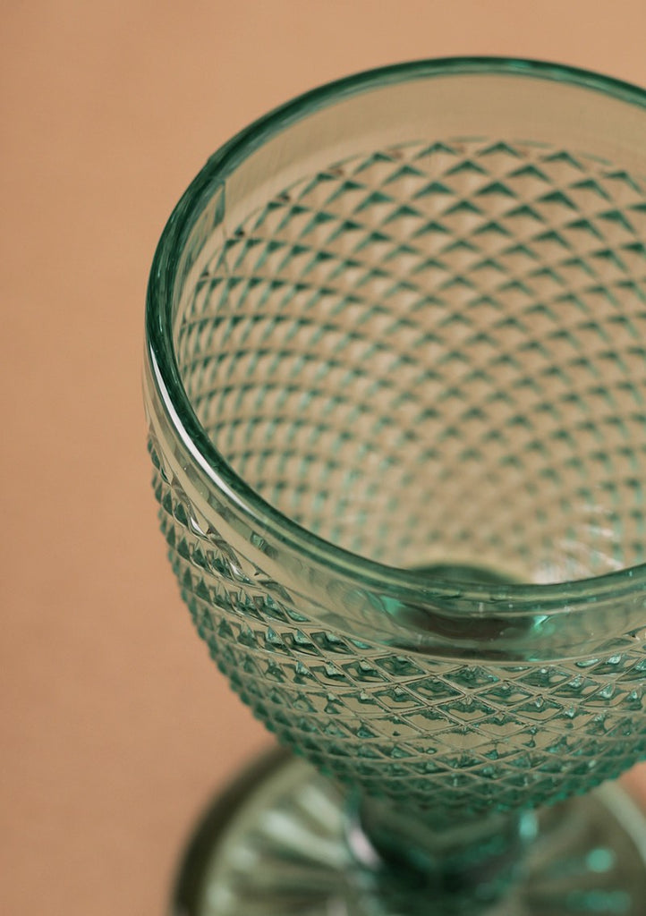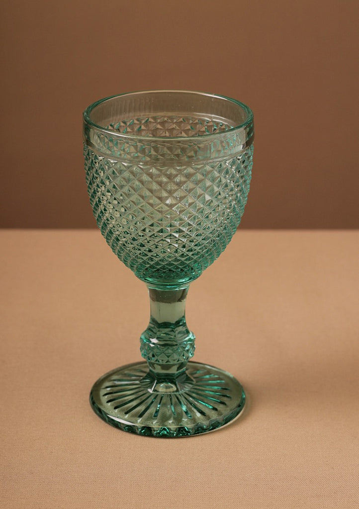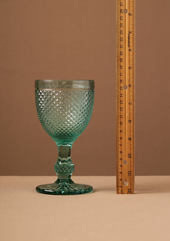 DESCRIPCIÓN: Copa de cristal prensado con diseño original de corte diamante chico en color turquesa-aqua. Toda nuestra cristalería de colores es padrísima porque le dan a tu mesa un toque de color tanto divertido como elegante. Puedes mezclar colores... ¡Queda increíble!