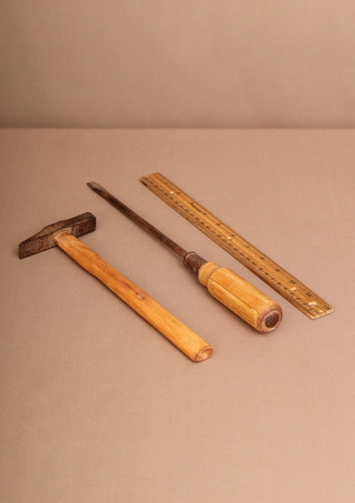 DESCRIPCIÓN: Juego de martillo con atornillador vintage, ideal como decoración para jardín o terraza.