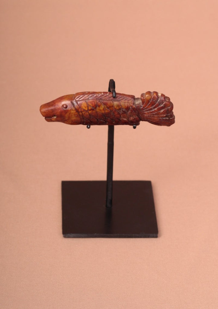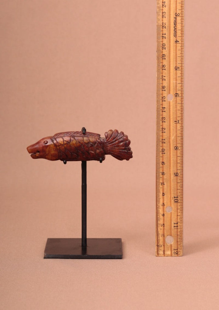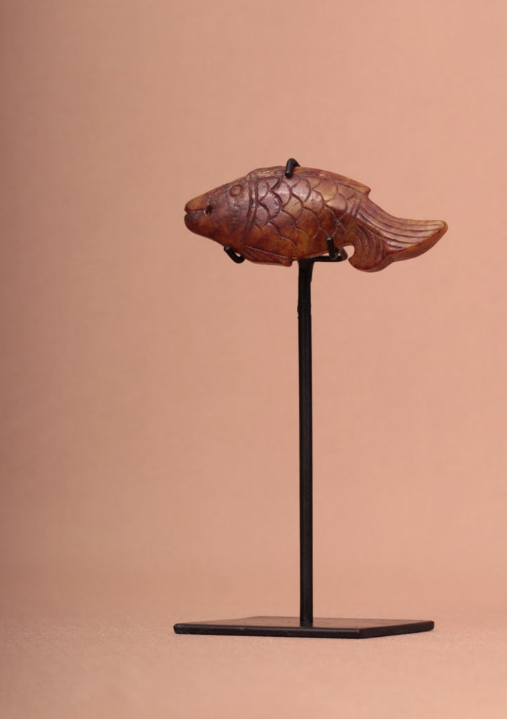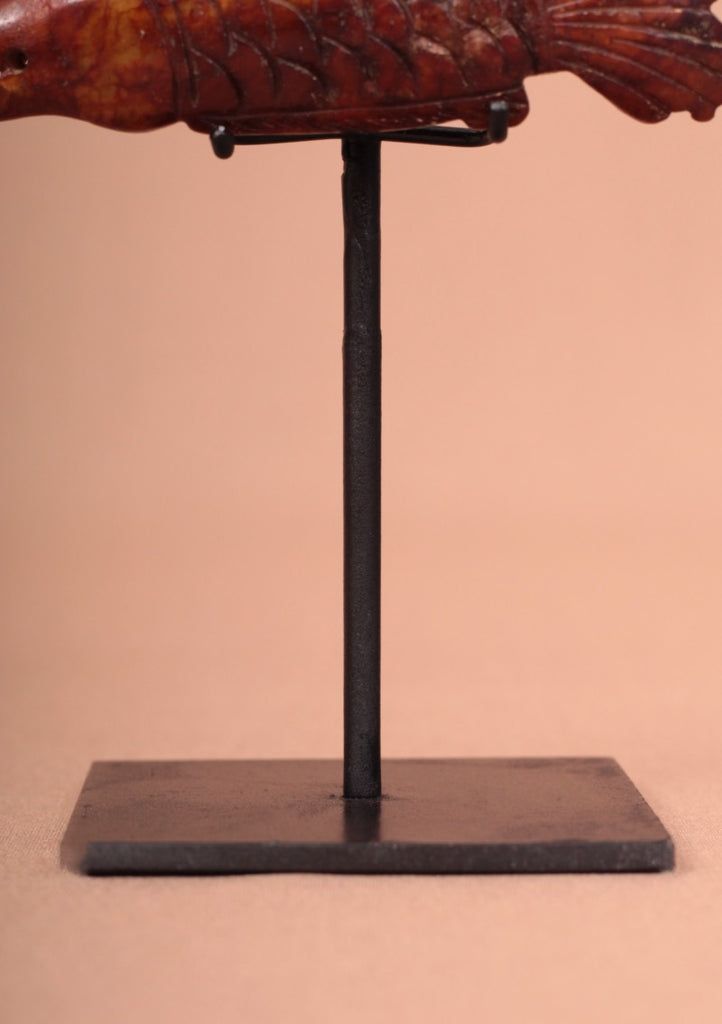 DESCRIPCIÓN: Este Pez de piedra roja, utilizada desde la antigüedad, está tallado a mano y está montado en una base de hierro, como escultura. Ideal para decorar estantes o libreros.