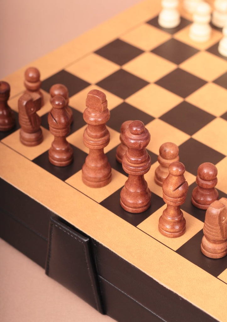 Ajedrez de curpiel con piezas plásticas. Excelente para casas en la playa o lugares con mucha humedad. La verdad, un juego tan clásico como el ajedrez es un regalo sin falla!