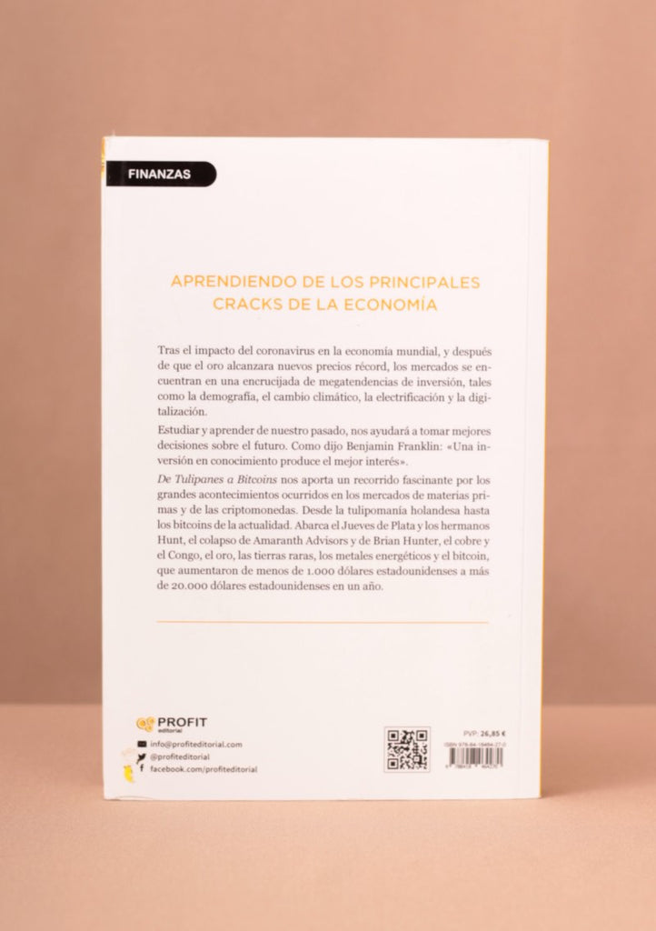 De tulipanes a Bitcoins nos aporta un recorrido fascinante por los grandes acontecimientos ocurridos en los mercados de materias primas y de las criptomonedas. Desde la tulipomanía holandesa hasta los bitcoins de la actualidad. Abarca el Jueves de Plata y los hermanos Hunt. El colapso de Amaranth Advisors y de Brian Hunter. El cobre y el Congo, el oro, las tierras raras, los metales energéticos y el bitcoin. Todos ellos aumentaron de menos de 1.000 dólares estadounidenses a más de 20.000 dólares estadounidenses en un año. En esta obra el autor describe en 42 capítulos las burbujas especulativas más importantes y vibrantes en los mercados de productos básicos y criptográficos.