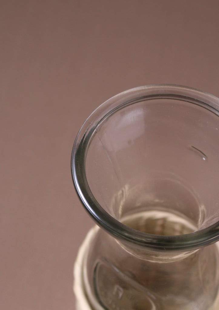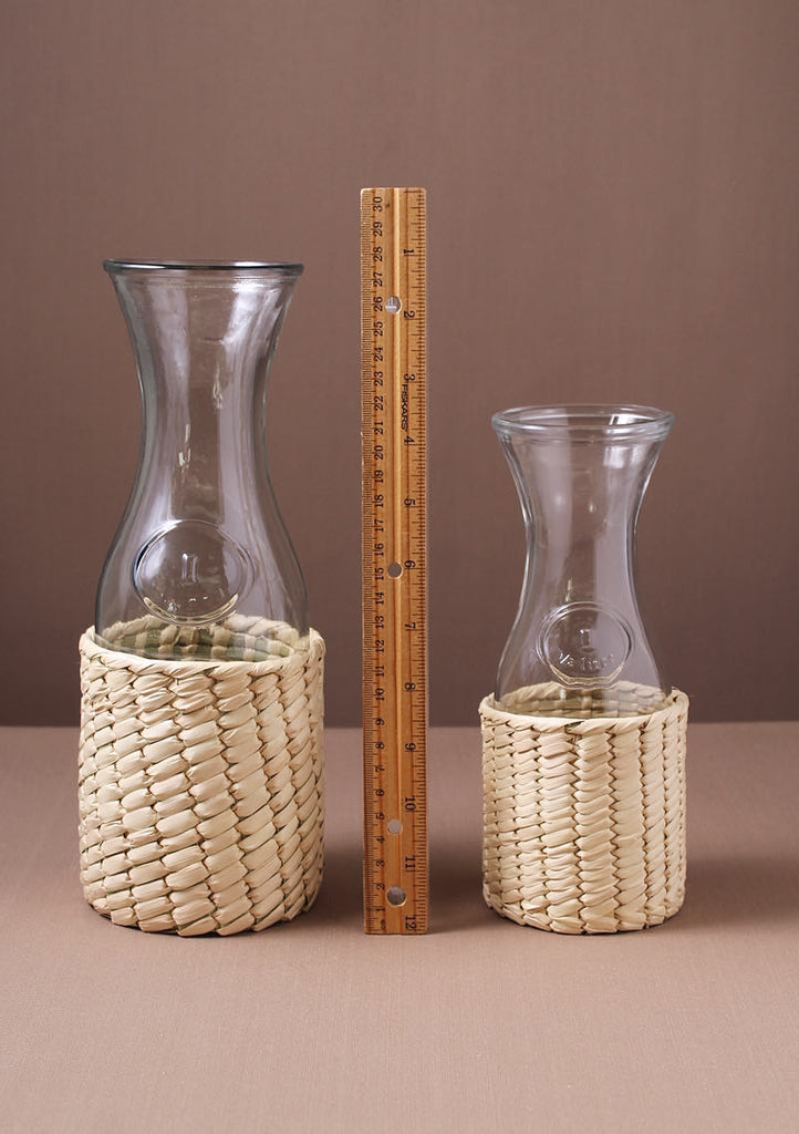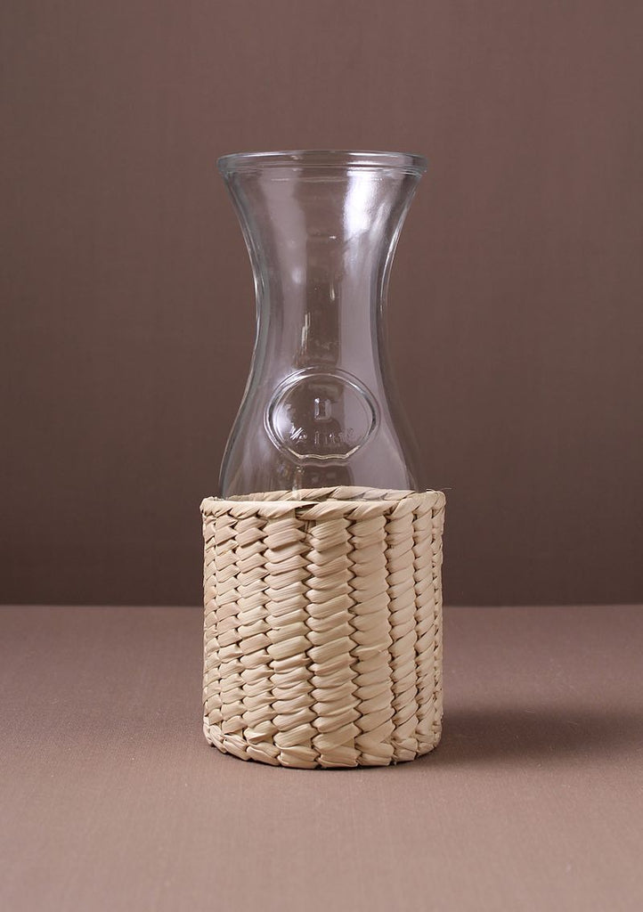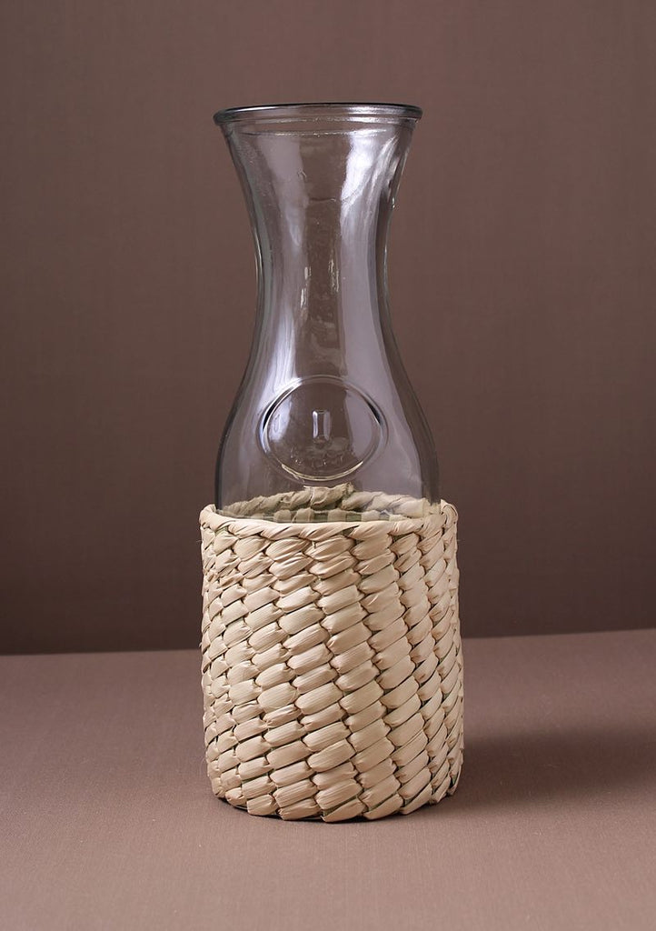 DESCRIPCIÓN: Jarra de vidrio de 1 litro o de 1/2 litro con diseño vintage y funda de palma. Esta línea es 100% mexicana elaborada por artesanos de Guerrero.