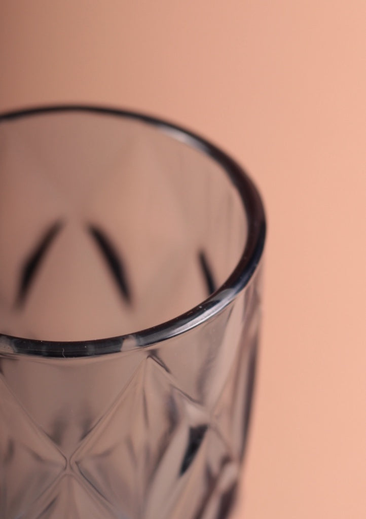 DESCRIPCIÓN: Copa de cristal prensado con diseño original de corte diamante en color gris humo. Toda nuestra cristalería de colores es padrísima porque le dan a tu mesa un toque de color tanto divertido como elegante. Puedes mezclar colores... ¡Queda increíble!