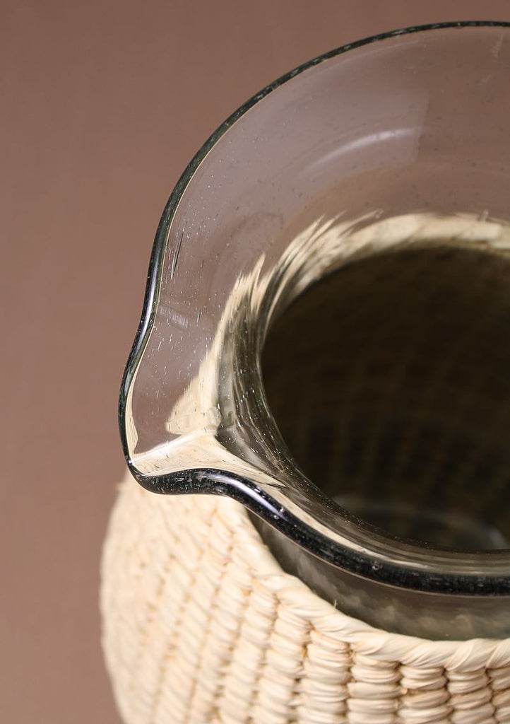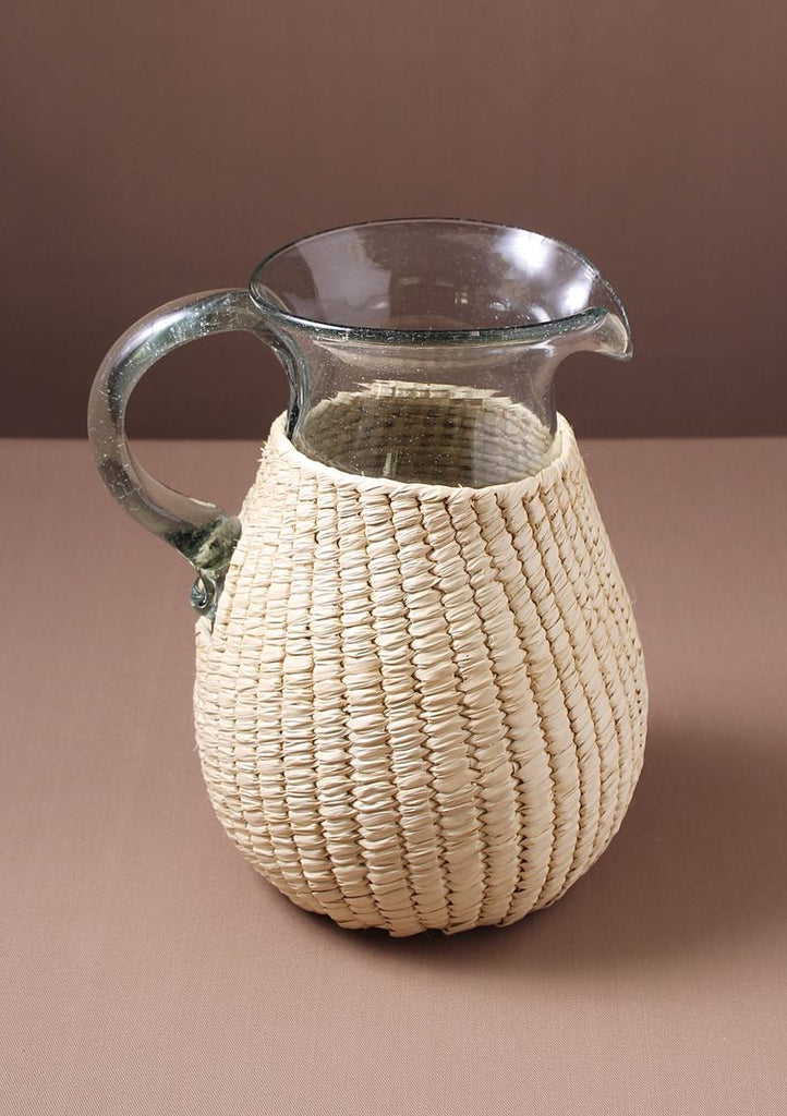 DESCRIPCIÓN: Jarra hecha de vidrio soplado con funda de palma artesanal de Guerrero. Para las mesas y cocinas mexicanas, los productos de palma natural mezclan lo chic con lo cool y lo mexicano! La palma también ayuda a mantener los líquidos a temperaturas frías.