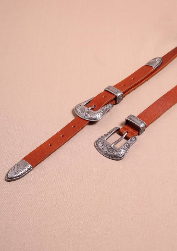 DESCRIPCIÓN: ¡Doble hebilla, doble estilo! Hecho con cuero genuino; hebillas, presillas y terminados dobles plateadas. ¡Este cinturón definitivamente elevará cualquier estilo vaquero, vintage o bohochic!