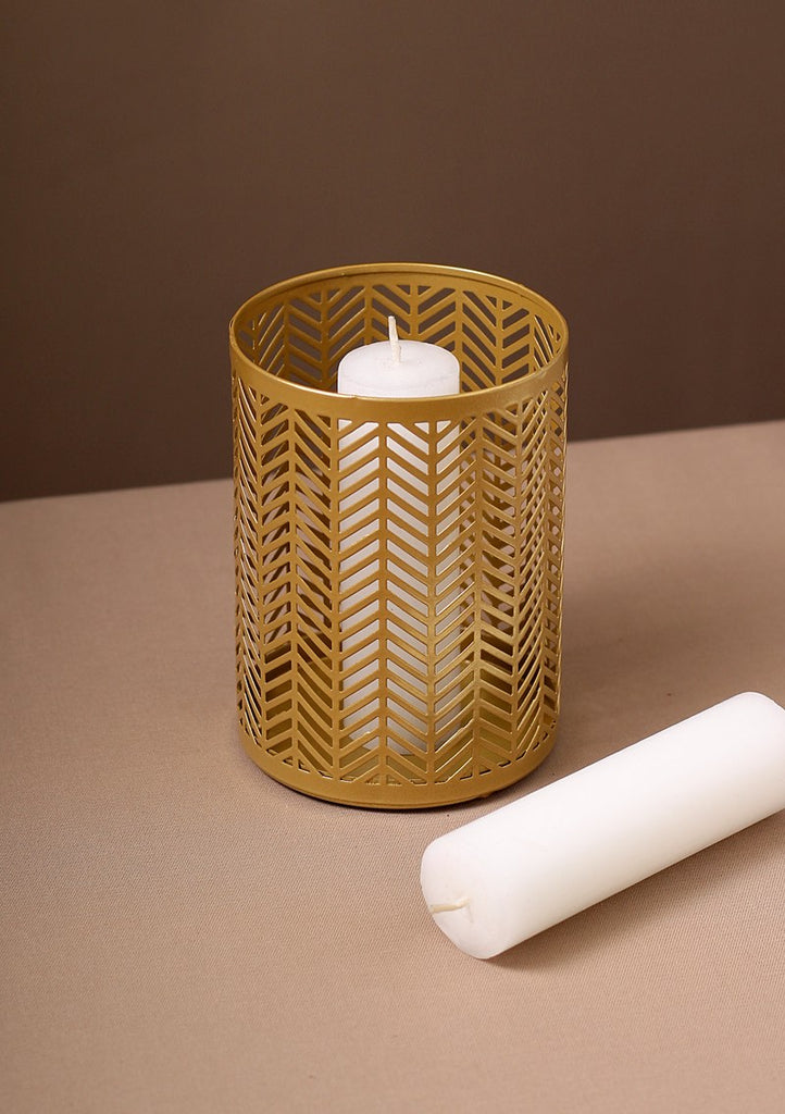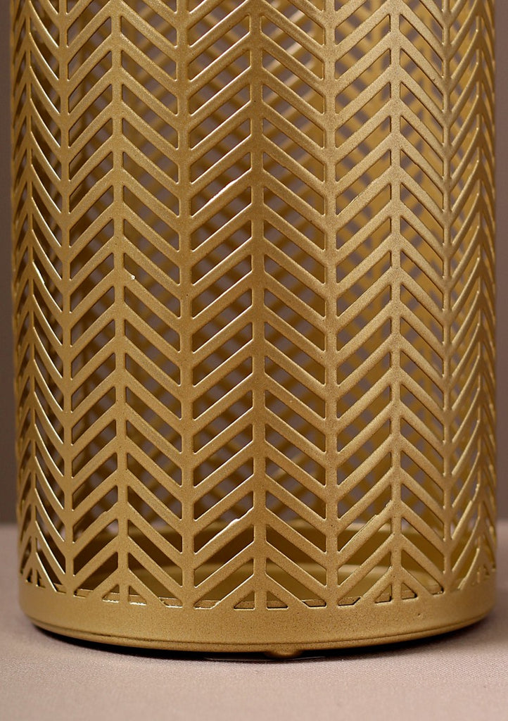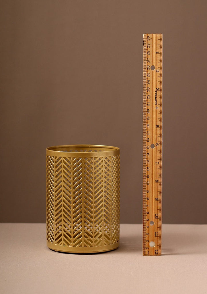 DESCRIPCIÓN: Contenedor de metal dorado con acabado mate, tiene un tamaño perfecto para usarlo de distintas formas, ya sea como portavelas, como lapicero, como porta-cubiertos o como florero para decorar tu mesa/casa (puedes usar un vasito transparente para poner dentro con agua).