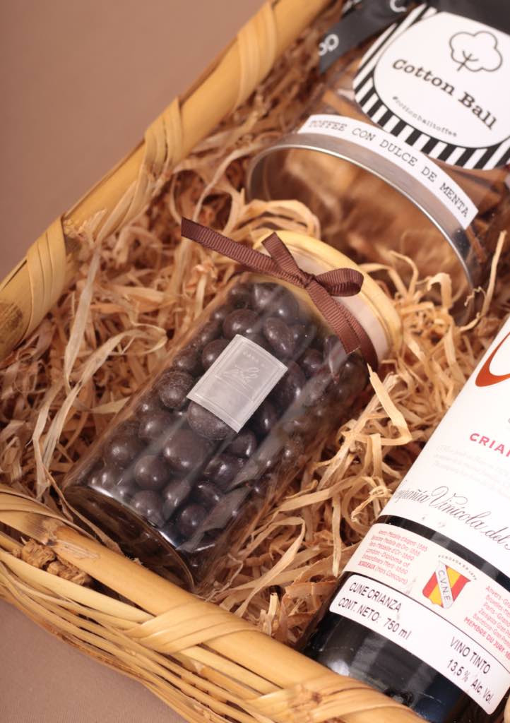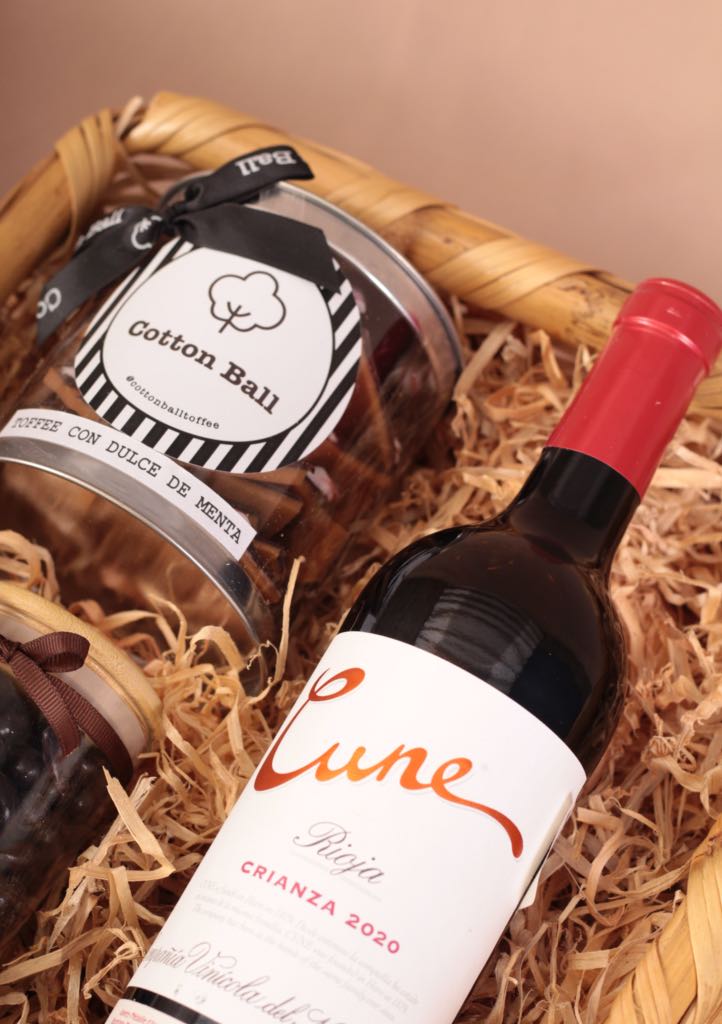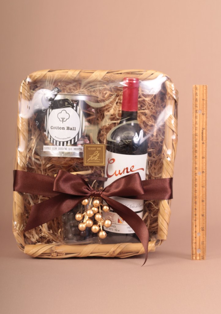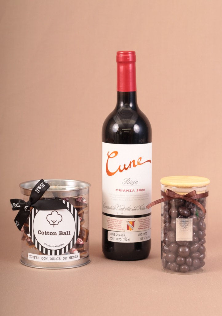 CONTENIDO: Canasta | Botella de vino tinto Cune Rioja | Lata de toffe con menta | Un frasco con tapa de bambú con arándanos cubiertos de chocolate amargo.