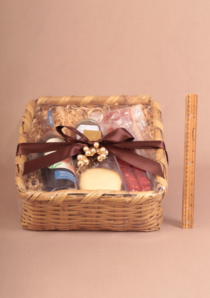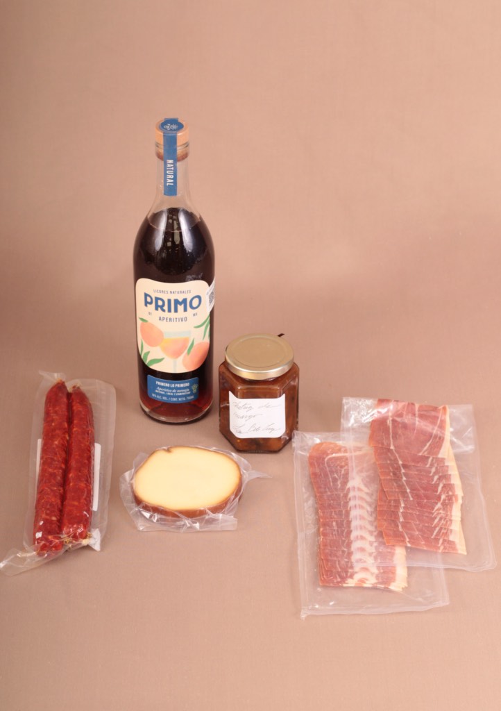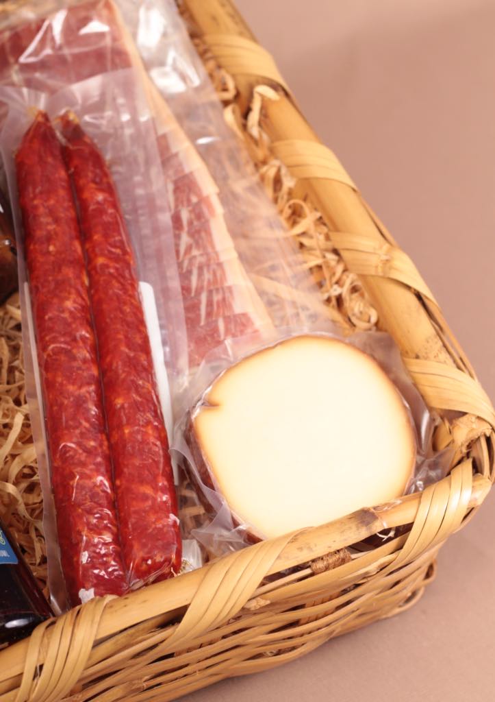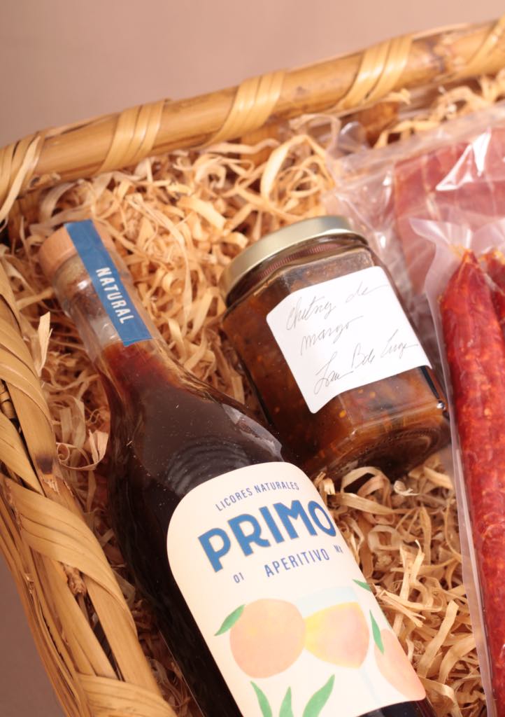 CONTENIDO: Canasta | Botella de aperitivo de toronja | 265 ml de chutney de mango | 1 pieza de queso provoleta | 2 piezas de chorizo vela | 2 paquetes de jamón serrano.