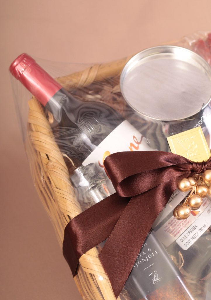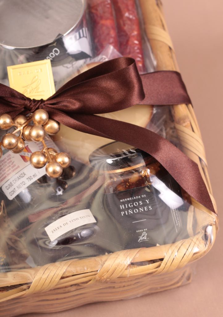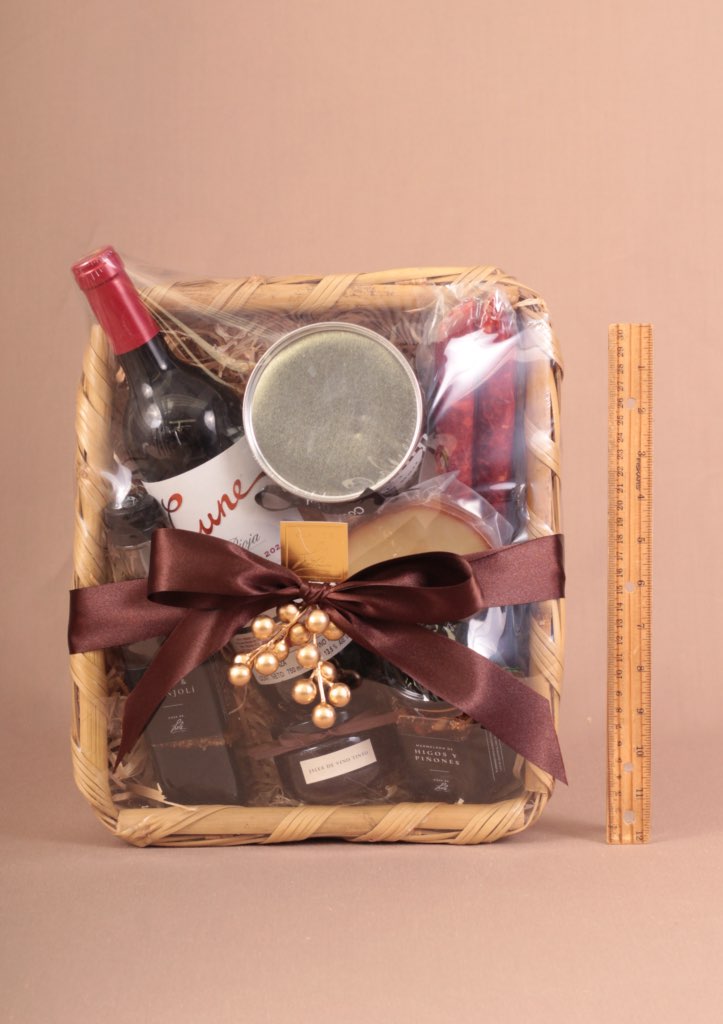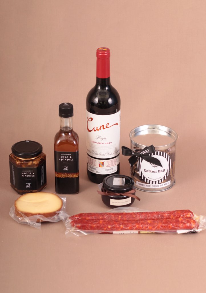 CONTENIDO: Canasta | Botella de vino tinto Cune Rioja | 265 ml de mermelada de higos y piñones | 1 pieza de queso provoleta | 2 piezas de chorizo vela | 60 ml de jalea de vino tinto | 250 g de vinagreta de soya y ajonjolí | 1 lata de toffe de dulce de menta