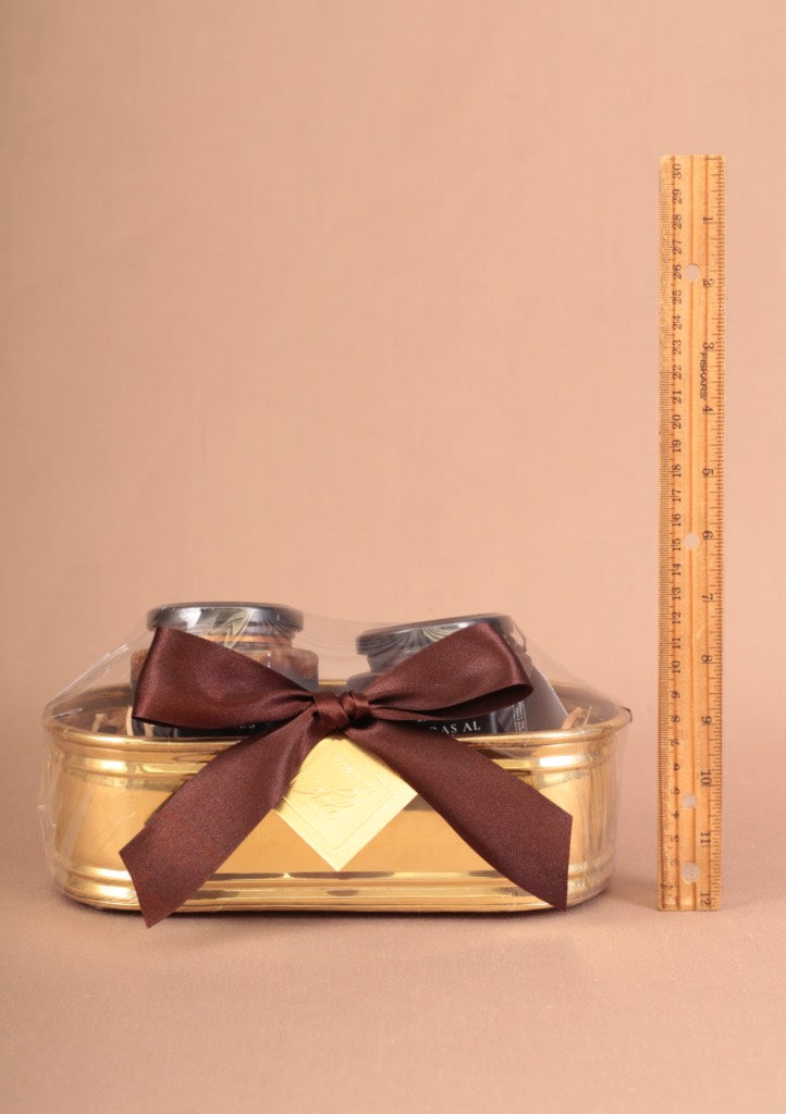 CONTENIDO: Tinita dorada de latón | Mermeladas gourmet de frutos rojos e higos y piñones 310g.